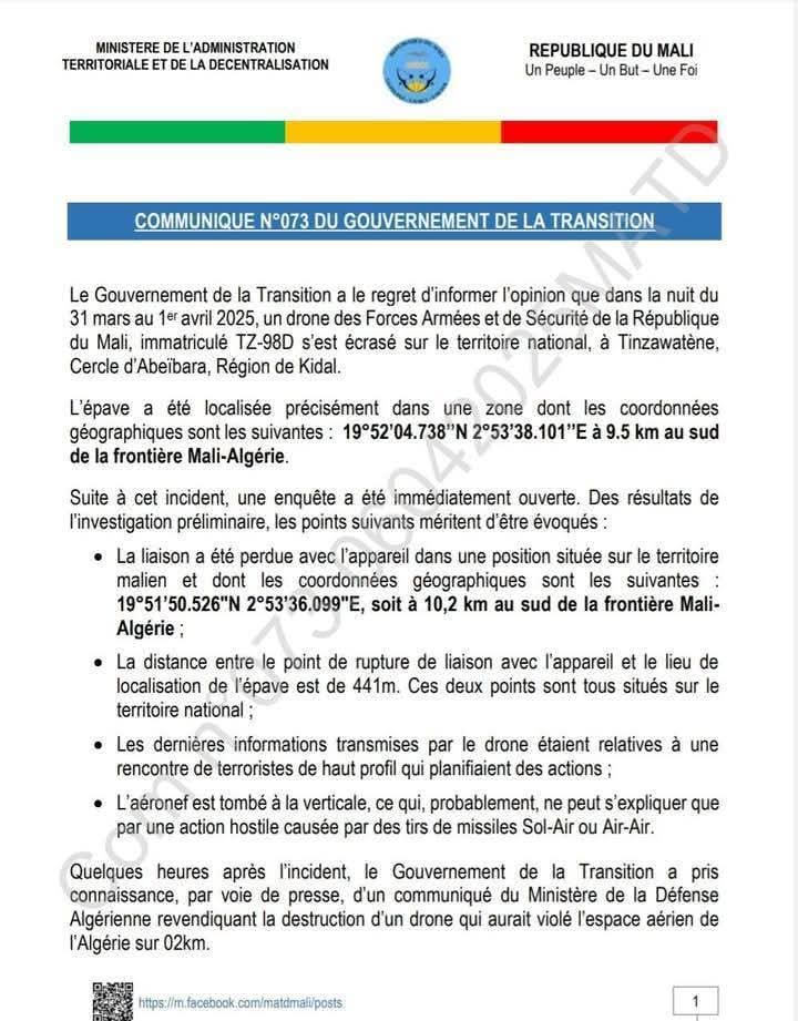 الجماعة كانت تكذب بيان وزارة الدفاعالمضحك في الموضوع كله ان مالي تتهم الجزائر رغم ان هذه الاخيرة هي من أعلنت أصلا عن الاسقاط في وقت لم يعلم الماليون ماذا حدث لمسيرتهم ههه