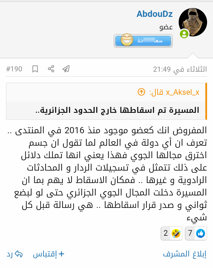 أولاً، جميع البيانات المتعلقة بهذا الحادث متوفرة في قاعدة بيانات وزارة الدفاع الوطني الجزائرية، ولا سيما صور الرادار التي تثبت بوضوح انتهاك المجال الجوي الجزائري.