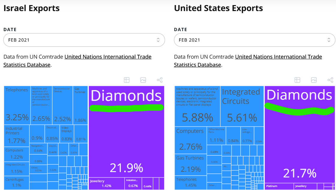 إسرائيل تُعدُّ واحدة من المراكز العالمية الرائدة في تجارة الألماس، خاصة في مجال قطع الألماس الخام وصقله وتصديره.