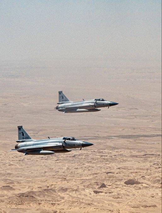 تحلق طائرتان مقاتلتان من طراز JF-17 Thunder تابعتان للقوات الجوية الباكستانية في تشكيل جوي فوق الجيزة في شمال وسط مصر خلال مناورات عسكرية دولية.