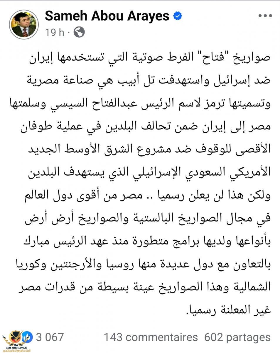 Jokerr قال: ممكن هذا هو سبب قطع اسرائيل الغاز عن مصر لوقف دعم مصر لإيران مشاهدة المرفق 792050 أنقر للتوسيع... كفو يامصر وما خفي كان اعظم ان كان هذا ماقامت مصر بإعطائه لإيران، فمالذي تخفيه مصر عن العالم