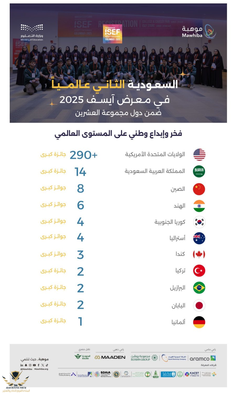 وحقَّق المنتخب السعودي هذا الإنجاز التاريخي في معرض "ريجينيرون الدولي للعلوم والهندسة (آيسف 2025)"، الذي أقيم في مدينة كولومبس بولاية أوهايو الأمريكية، بمشاركة أكثر من 1700 طالب وطالبة، يمثلون أكثر من 70 دولة حول العالم.