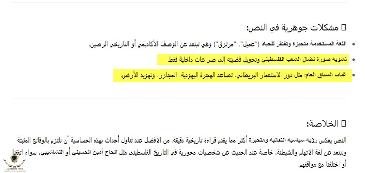 النص يعكس رؤية سياسية متحيزة لصهيوني عربي يريد يغير من الحقائق التاريخية.