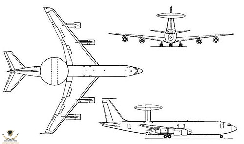 الأبعاد | الطول: 46.6 م – امتداد الجناح: 44.4 م – الارتفاع: 12.7 م – قطر القبة الرادارية: 9.1 م |
