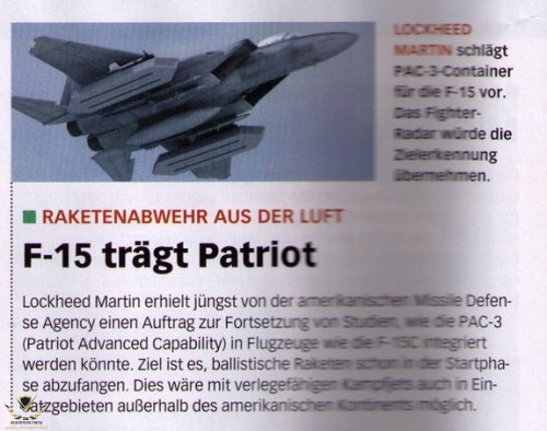 Lockheed Martin تلقّت مؤخرًا من الوكالة الأمريكية للدفاع الصاروخي (Missile Defense Agency) عقدًا لمواصلة دراسات حول إمكانية تركيب صاروخ PAC-3 (Patriot Advanced Capability) على طائرة F-15. الهدف من ذلك هو تمكين المقاتلة من اعتراض الصواريخ الباليستية خلال مرحلة الإطلاق أو الطيران المبكر.