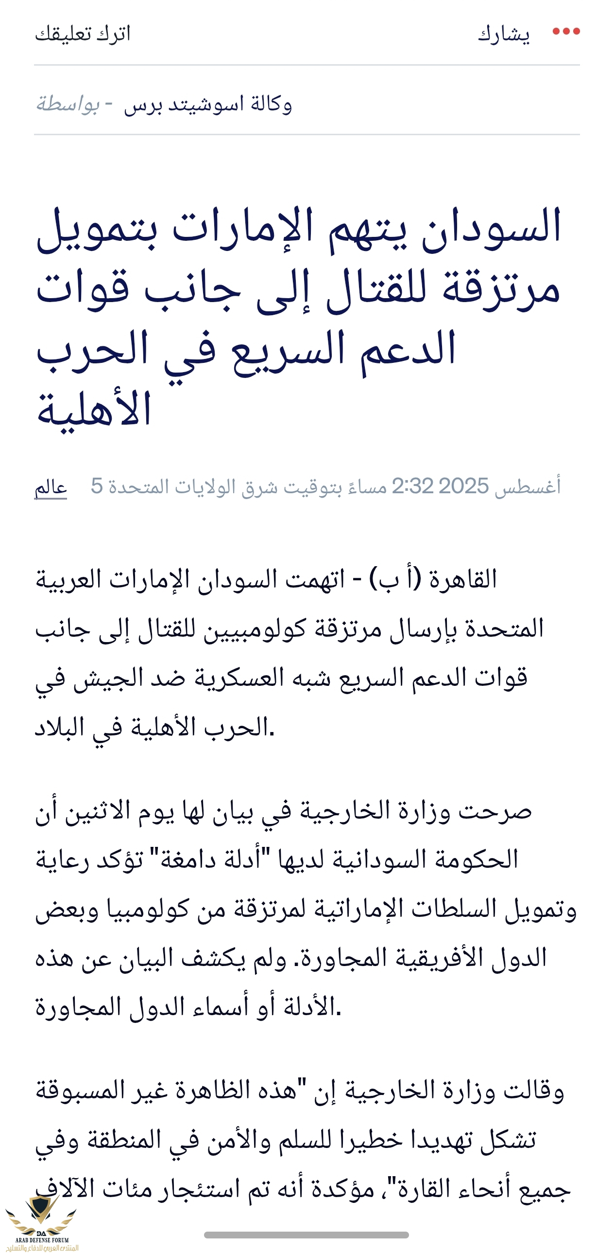 التاريخ: يوم 6 أغسطس 2025، نفّذت القوات الجوية السودانية غارة جوية على طائرة تابعة للإمارات العربية المتحدة أثناء هبوطها في مطار نيالا في جنوب دارفور، التي يسيطر عليها ميليشيا قوات الدعم السريع (RSF). أسفرت الغارة عن تدمير الطائرة ومقتل ما لا يقل عن 40 مرتزقاً كولومبياً كانت على متنها .