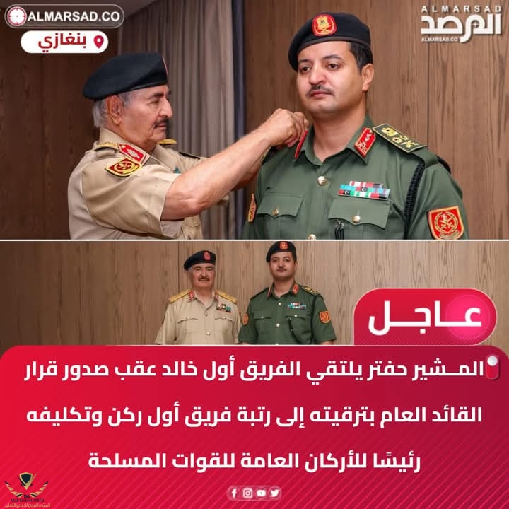🚨 عاجل > جانب من لقاء المشير حفتر مع الفريق أول خالد عقب صدور قرار القائد العام بترقيته إلى رتبة فريق أول ركن وتكليفه رئيسًا للأركان العامة للقوات المسلحة. ( القيادة )