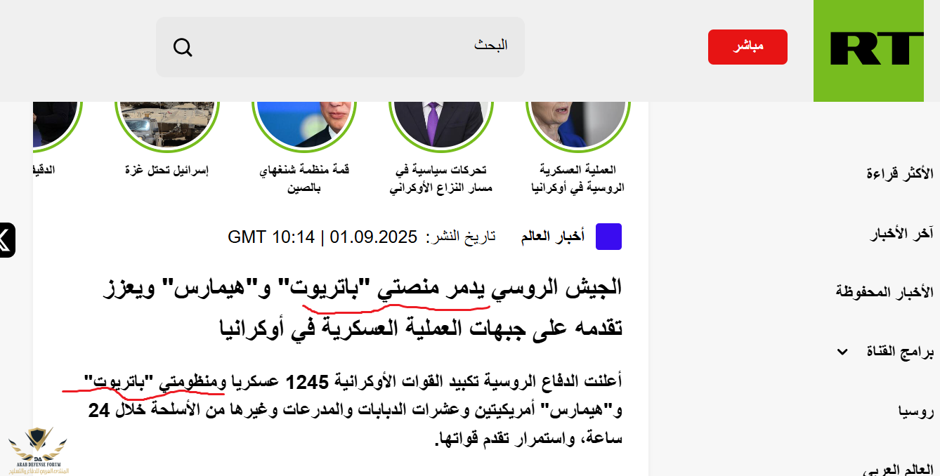 أعلنت الدفاع الروسية تكبيد القوات الأوكرانية 1245 عسكريا ومنظومتي "باتريوت" و"هيمارس" أمريكيتين وعشرات الدبابات والمدرعات وغيرها من الأسلحة خلال 24 ساعة، واستمرار تقدم قواتها.