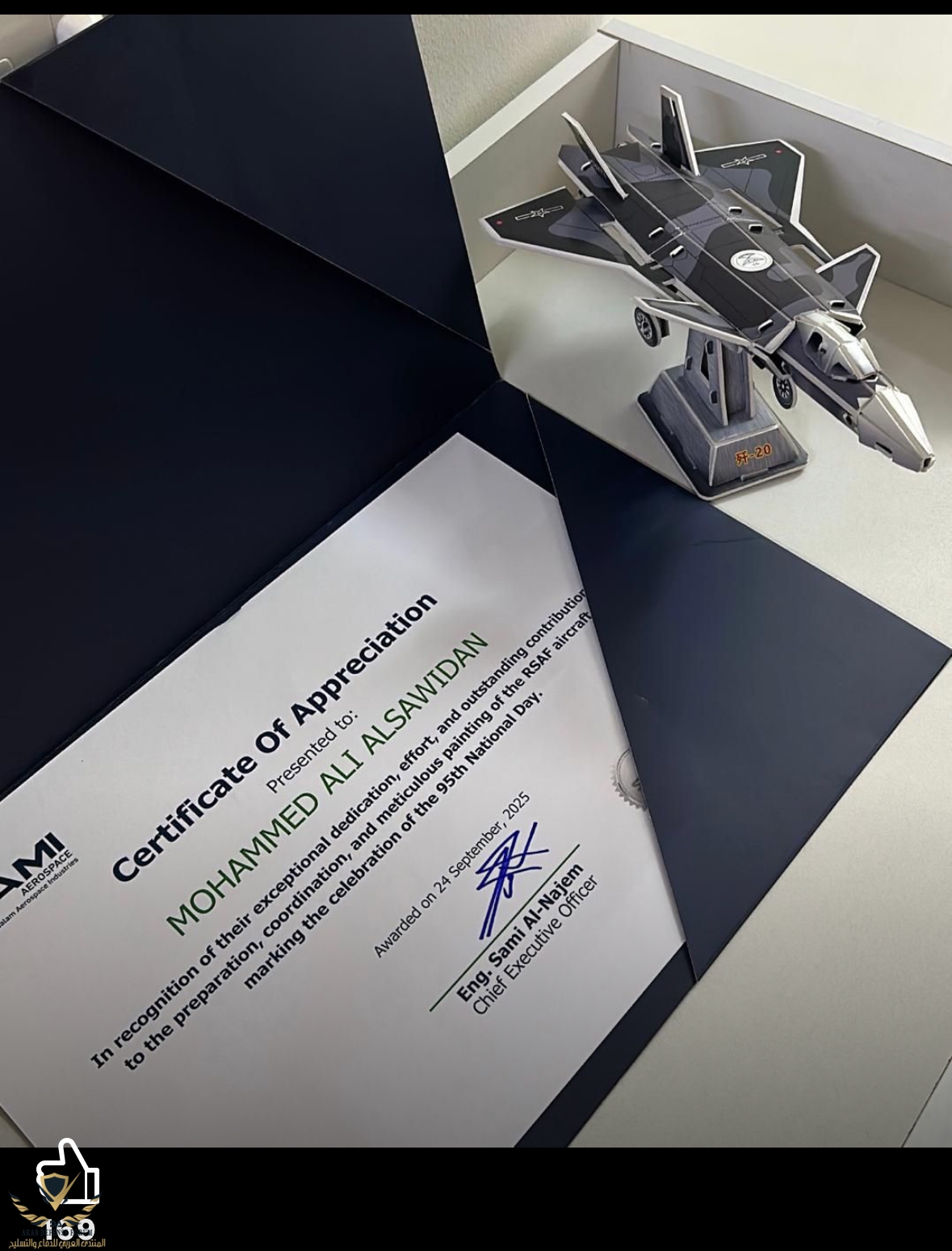 ‏تكريم لأحد موظفين شركة سامي ويظهر بجانبه مجسم j-20