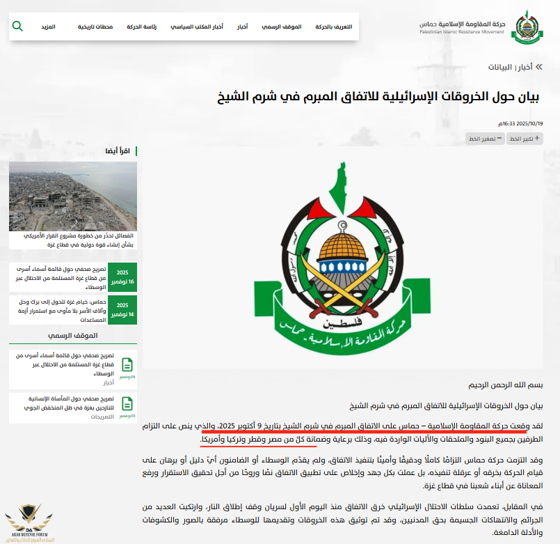 تفضل من الموقع الرسمي لحماس يعلن فيه توقيع حماس على إتفاق وقف النار في غزة بقمة شرم الشيخ؟ إذن لماذا اليوم هي ترفض؟ وهي نفسها من وافقت عليه؟ ولماذا تطالب من الجزائر رفضه؟ وهي لم تعين الجزائر ممثلة عنها في قمة شرم الشيخ؟