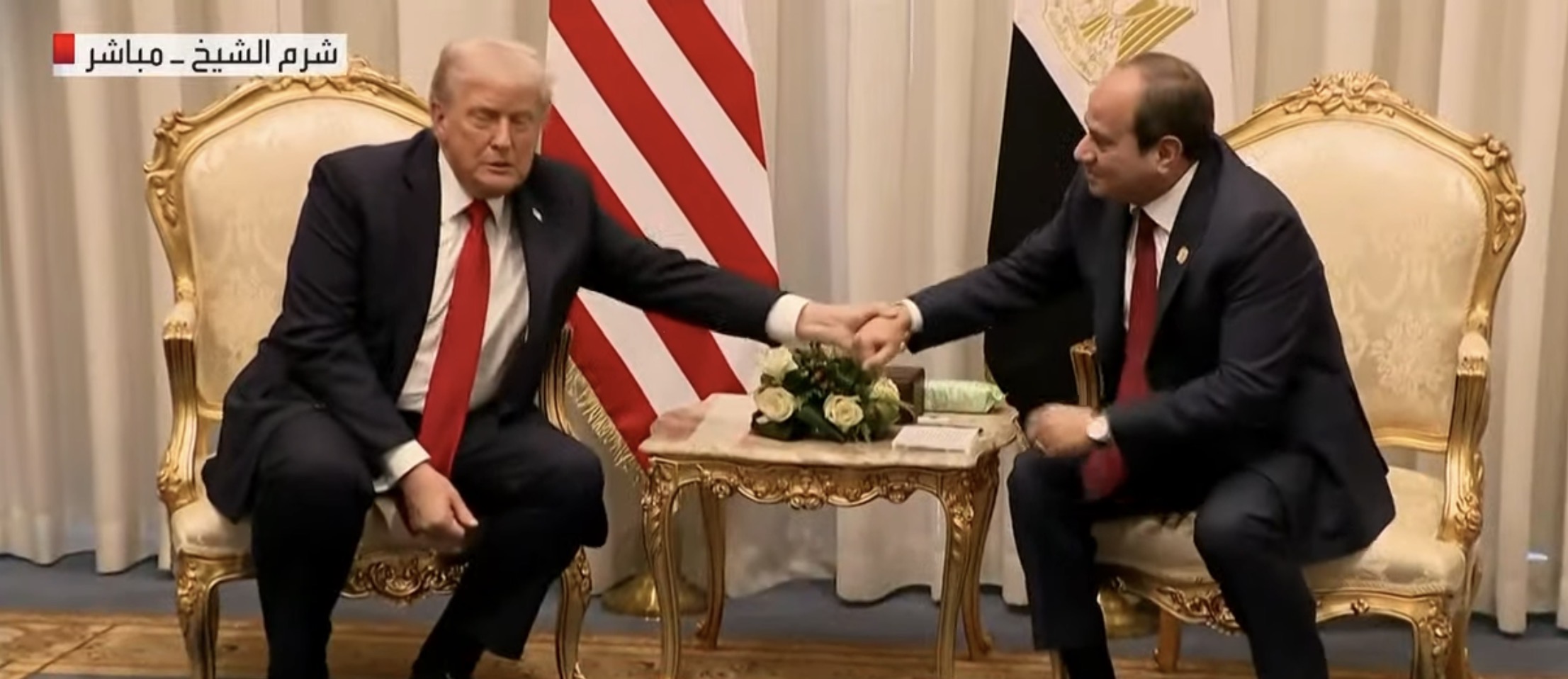 بعدما لطلعه ٥ ثواني خلاه ينتظر ، وفوق كذا أعطاه يده اليسار، عجبني السيسي ، قال ترمب قاللا تزوروا الحقائق ثم قام السيسي وركض يمد يده لترامب ويبتسم قدام الكميرا