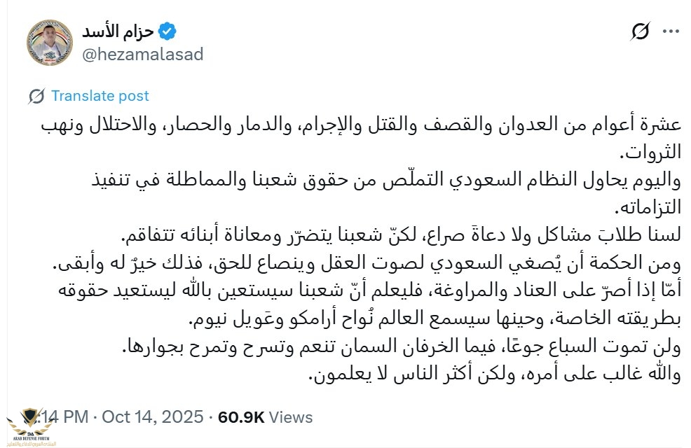 الحوثي حزام الأسد بعد وقف حرب غزة رجع ليهدد السعودية ويبحث عن ساحة جديدة ليشغل الشعب اليمني الذي يعاني من الفقر والجوع وانهيار البنية التحتية والاقتصادية