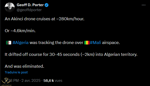 كشف الخبير الأمني الأمريكي المتخصص في شؤون شمال أفريقيا جيف دي بورتر في تغريدة له مؤخرًا عن نجاح قوات الدفاع الجوي الجزائرية في إسقاط طائرة مسيرة تركية متطورة بعد اختراقها الأجواء الجزائرية.