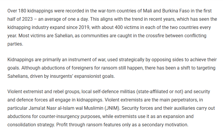 كما شهدت مالي خلال الأشهر الأخيرة سلسلة من عمليات الاختطاف استهدفت أجانب يعملون في مشاريع تنموية ومناطق تعدين، إذ اختُطف خمسة هنود يعملون في مشروع كهرباء قرب كوبري غربي باماكو، وأربعة صينيين في منطقة كايس منذ يوليو الماضي، إلى جانب إيراني واحد في سبتمبر.