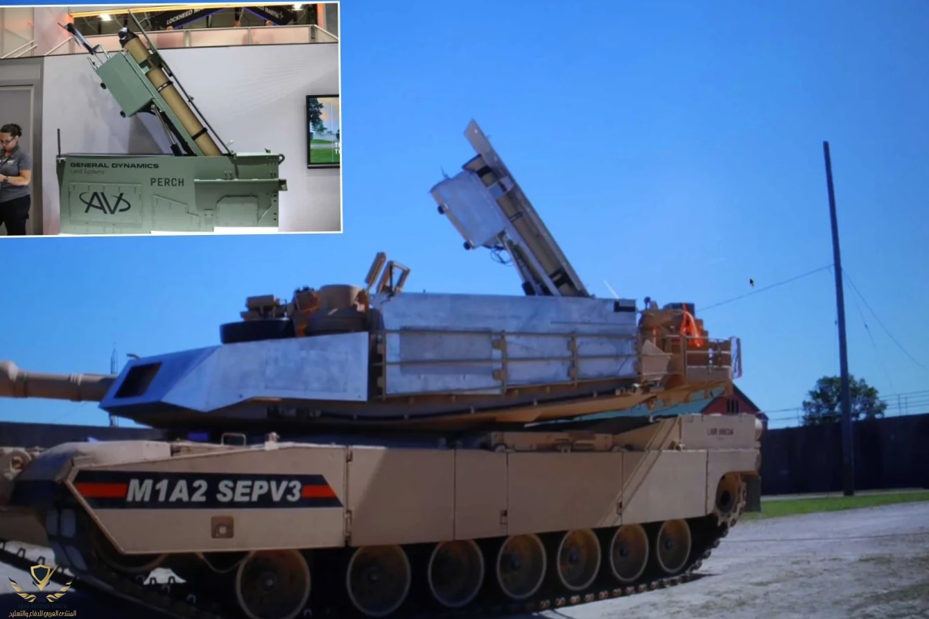 الذخيرة المتسكعة PERCH، المُدمجة في دبابة M1A2 Abrams SEPv3 التابعة للجيش الأمريكي، في معرض AUSA 2025، مُستعرضةً قدرةً جديدةً على إطلاق النار فوق الأفق دون تعديل هيكل الدبابة.
