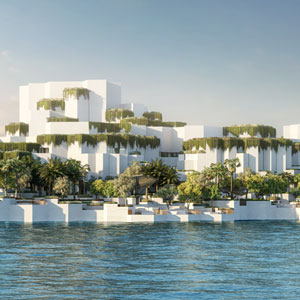 العمل واضح أنه ضمن العمارة الحديثة مع تأثير قوي من: الطراز العضوي المباني متدرجة أشبه بالأسلوب اليوناني Santorini أو بعض مشاريع Bjarke Ingels Group (BIG) + كتل بيضاء ناعمة + طبيعة خضراء متدلية + الطراز المستقبلي + طراز البحر المتوسط و ليس طراز عربي تقليدي