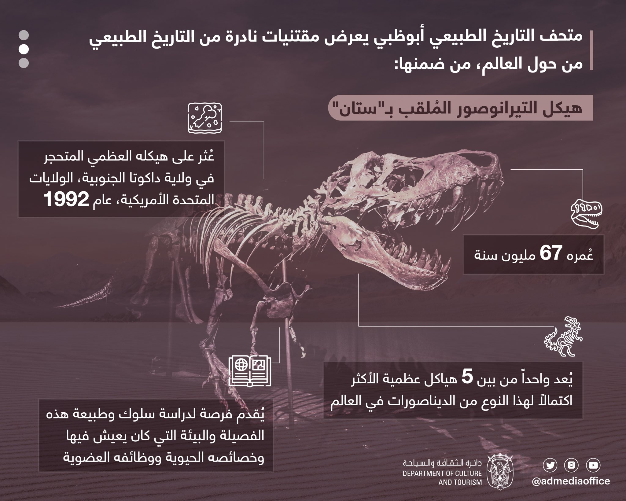 ويُعزز افتتاح متحف التاريخ الطبيعي أبوظبي مكانة دولة الإمارات العربية المتحدة على خريطة الثقافة والبحث العلمي عالمياً، من خلال إتاحة الفرصة أمام الزوّار والباحثين لعيش رحلة تمتد عبر 13.8 مليار عام من تاريخ الأرض والكون والحياة، عبر معارض وتجارب تفاعلية وأبحاث علمية رائدة تجمع بين التاريخ والمعرفة والاكتشاف في مكان واحد.