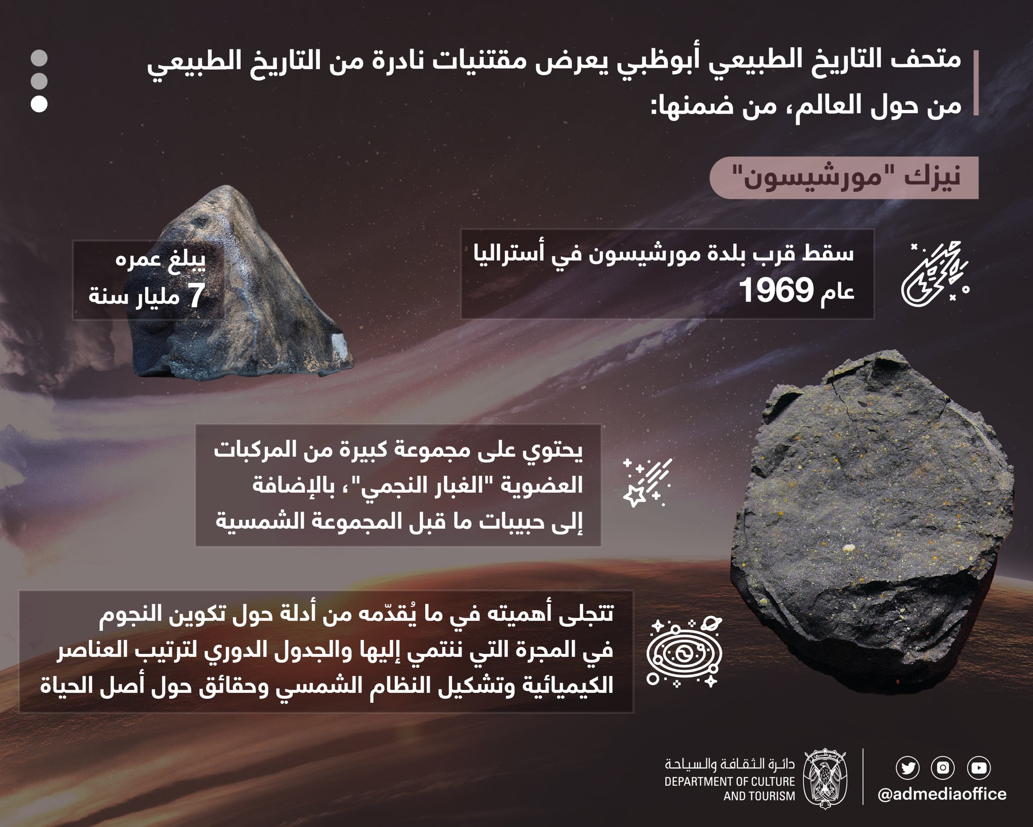 ويضم المتحف مجموعات نادرة من النيازك والأحفوريات العملاقة، ومشاهد مُعاد تخيُّلها للعالم الطبيعي في أبوظبي، إلى جانب معارض تفاعلية وبرامج تعليمية تُعرِّف الزوّار بتاريخ الكون والتنوّع البيولوجي، إلى جانب احتضان المتحف مركزاً بحثياً متخصصاً يُعنى بعلوم الحفريات والأحياء والبيئة، إسهاماً في توسيع دائرة المعرفة والثقافة، ودعماً للجهود الدولية الرامية إلى حماية الطبيعة واستدامتها للأجيال القادمة.