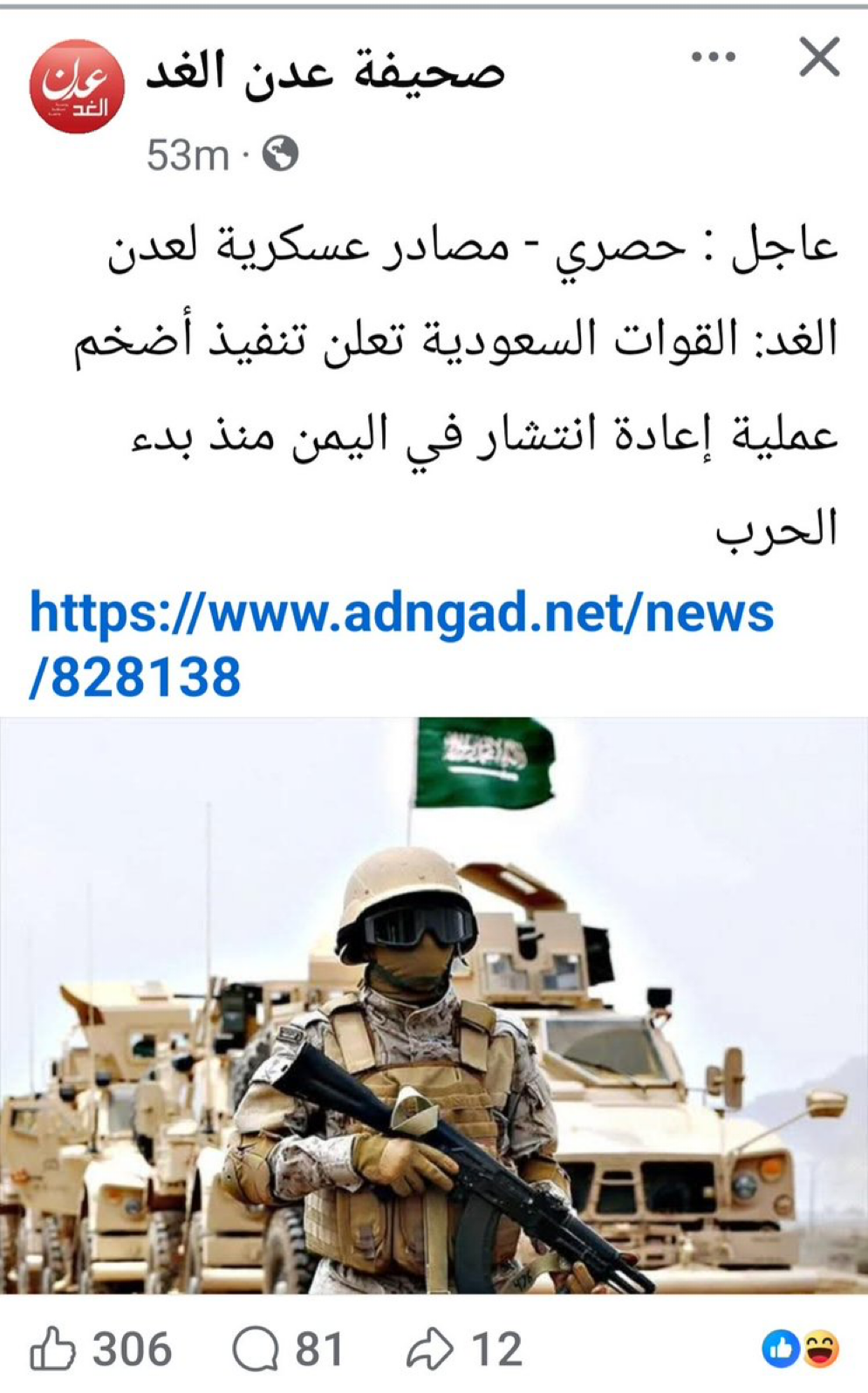 ‏أكدت مصادر عسكرية رفيعة المستوى، السبت، أن القوات السعودية بدأت تنفيذ أكبر خطة إعادة انتشار عسكري منذ دخولها الصراع في اليمن قبل سنوات. وتُوصف هذه الخطوة بأنها إعادة تموضع شاملة للتواجد العملياتي السعودي في جميع أنحاء البلاد.