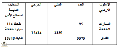 في هذه الفترة عمد الارهاب الى التدمير واستعمل بشكل مكثف السيارات المفخخة والقنابل التي راح ضحيتها 3335 شخص بين 30 سبتمبر 92 وسنة 1996 وهذا مادى الى تشكيل ضغط رهيب على مصالح الامن والجدول التالي يلخص بعض الشيء الجدول في المرفقات