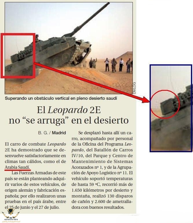 هذي الصورة أثناء التجارب الميدانية لدبابة Leopard 2E الإسبانية في السعودية، تم تزويد الدبابة بجهاز تكييف هواء خاص لتكييف المقصورة الداخلية، وذلك لمواجهة الظروف الصحراوية القاسية وارتفاع درجات الحرارة، بما يضمن قدرة الطاقم على التشغيل المستمر والدقة في أداء المنظومات الداخلية خلال المناورات والتدريب.