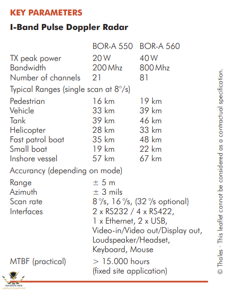 الرادار BOR-A 550 يرصد انسان من مسافة 16 كلم ، عربة من 33 كلم و دبابة من 39 كلم و مروحية من 28 كلم