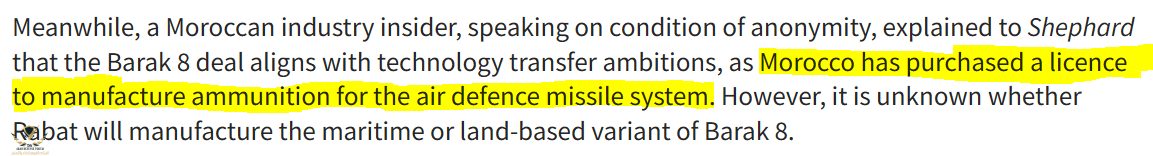 بحسب هذا المصدر ، اشترى المغرب تقنية تصنيع ذخيرة الدفاع الجوي, غالبا من الصين