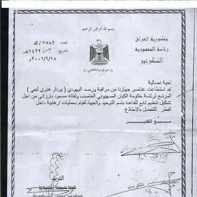 وثيقة من الاستخبارات العراقية من سنة 2001 ترصد اتصالات الجاسوس الصهيوني الفرنسي هنري ليفي بالمعارضة العراقية في الشمال قصد تكوين مليشيات جهادية للاطاحة بالنظام نفس الدور مارسه هذا الجاسوس في ليبيا بالتعاون مع الجماعة الليبية المقاتلة بقيادة الارهابي عبد الحكيم بالحاج حاكم طرابلس العسكري حاليا و يحاول فعله في سوريا مع الجماعات المسلحة المعارضة … نحن الان امام حرب صهيونية بالوكالة ذراعها الجماعات الجهادية المسلحة و بعض المعارضين المرتزقين في الغرب لتخريب الاوطان و تقديمها كهدية على طبق للشركات العالمية الصهيونية لتنهب مقدراتها يجب ان يفيق الشعب العربي لهذا المخطط الصهيوني و يتصدى له بكل قوة و بكل حزم.