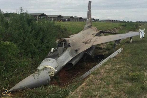 An F-16 fighter jet skidded off a taxiway and crashed into a drainage ditch in Nakhon Ratchasima Wednesday afternoon, damaging the aircraft but leaving the pilot only slightly hurt.