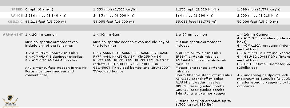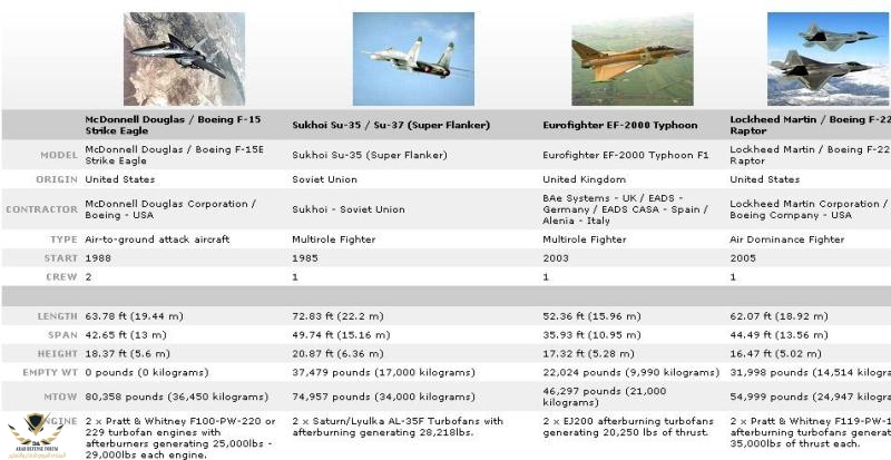 وضع التفاصيل الاساسية لكل مقاتلة سوف يتم عمل المقارنة التفصيلية عليها اولا : القتال الجوى