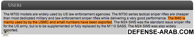 2-الجزائر تعتبر من مستخدمي القنّاصات الأمريكيّة لكن لا توجد معلومات عن نوع القنّاصات المستخدمة ٫٫ و هناك موقع يذكر الدول المستخدمة للقنّاصات الأمريكيّة من عائلة M700 و M24 و M40 بشكل مجمل دون تفصيل ٫٫٫٫ كما يذكر التقرير بأن القنّاصة M40 خاصّة بالمارينز USMC لكن تمّ تصدير عدد قليل من هذه القنّاصة