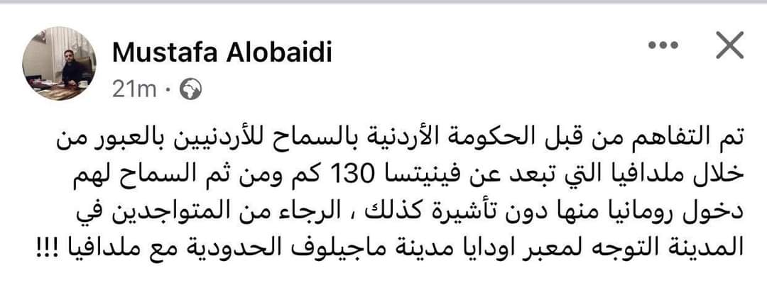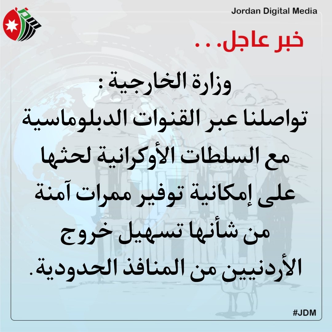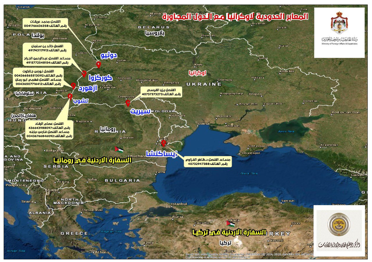 الاردن نسقت مع جميع الدول الحدودية مع أوكرانيا لتسهيل عبور الأردنيين واجلائهم، وأرسلت دبلوماسيين إلى المنافذ الحدودية لتسهيل عبورهم واستقبالهم...، واليوم تم الاتفاق مع مولدوفا لتسهيل عبور الأردنيين