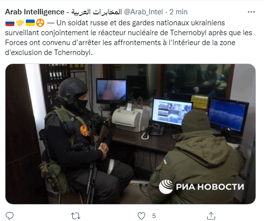 الروس بدهم ستره ليحكو رجعوها منهم الاوكرانقام جندي روسي ورجال الحرس الوطني الأوكراني بحراسة مفاعل تشيرنوبيل النووي بشكل مشترك بعد أن وافقت القوات على وقف الاشتباكات داخل المنطقة المحظورة تشيرنوبيل.