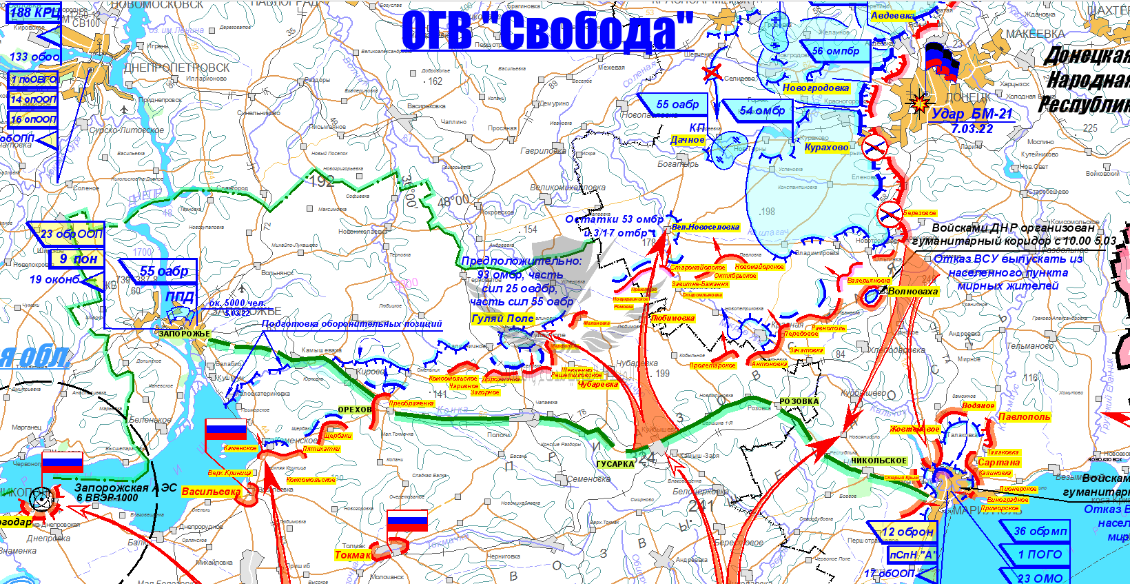 وهذه الجبهة الجنوبية و يظهر حصار ماريوبول في أسفل يمين الصورة و أيضا محاولة حصار القوات الأوكرانية في غرب دونيتسك