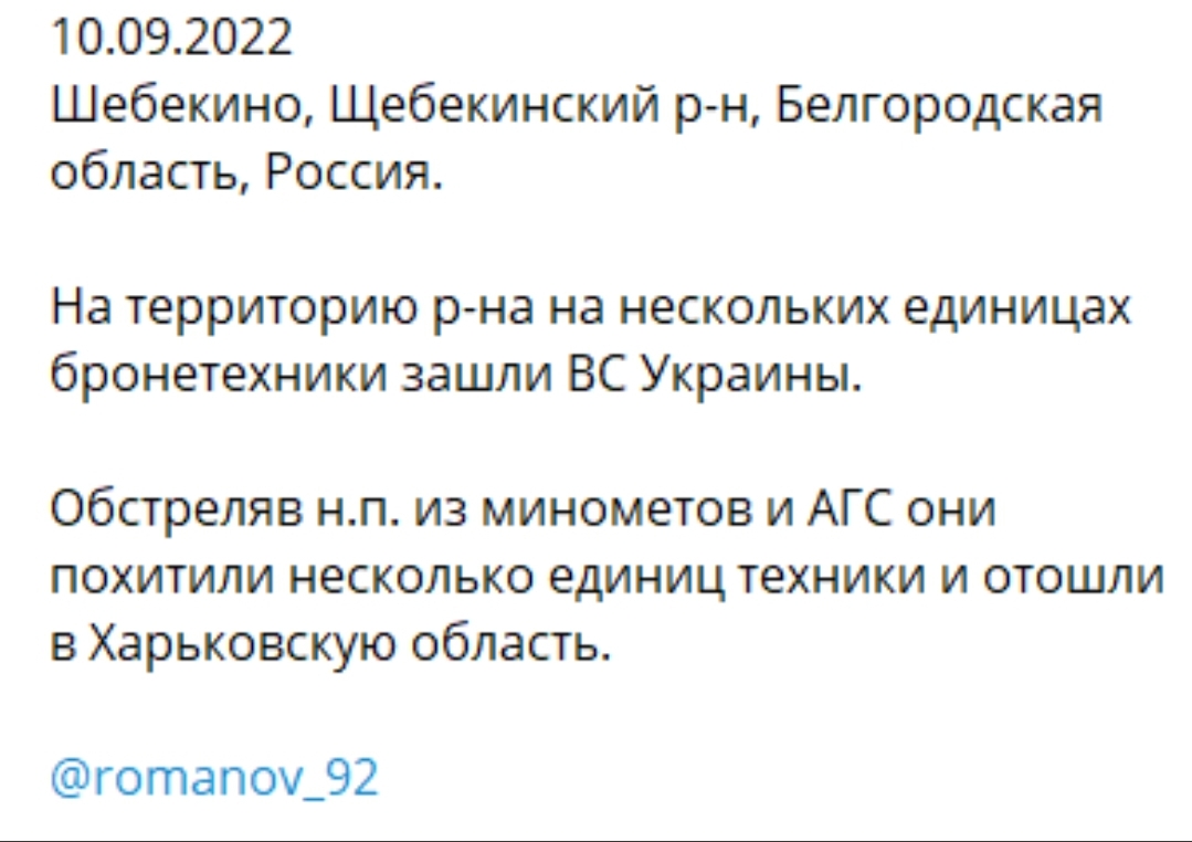 دخلت مركبات مدرعة أوكرانية الى أراضي المنطقة و أطلقوا النار على المستوطنة و سرقوا عدة معدات من قذائف الهاون وقاذفات AGS وتراجعوا مرة ثانية إلى منطقة خاركيف .
