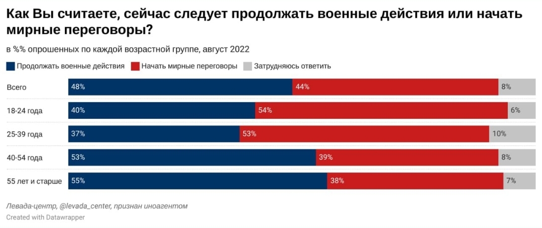 في إستبيان وإستطلاع لمواقف الروس من الحرب ، فقط 37% من فئة الأعمار التي تتراوح بين 25 - 39 عام دعموا الخيار العسكري ، وهذه الفئة هي المستهدفة في الأساس بالتعبئة العامة التي تطالب بها بعض الأصوات في روسيا .