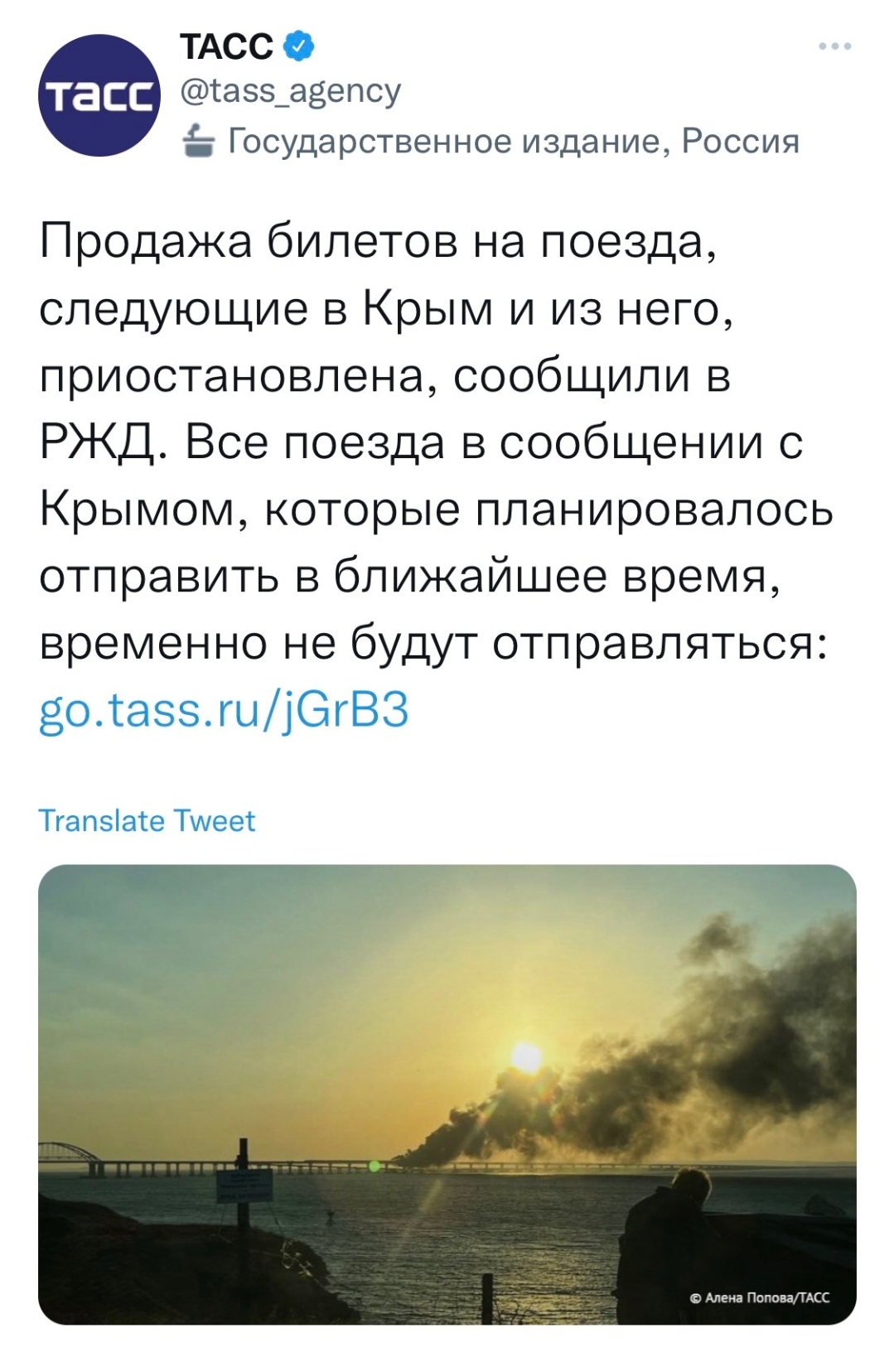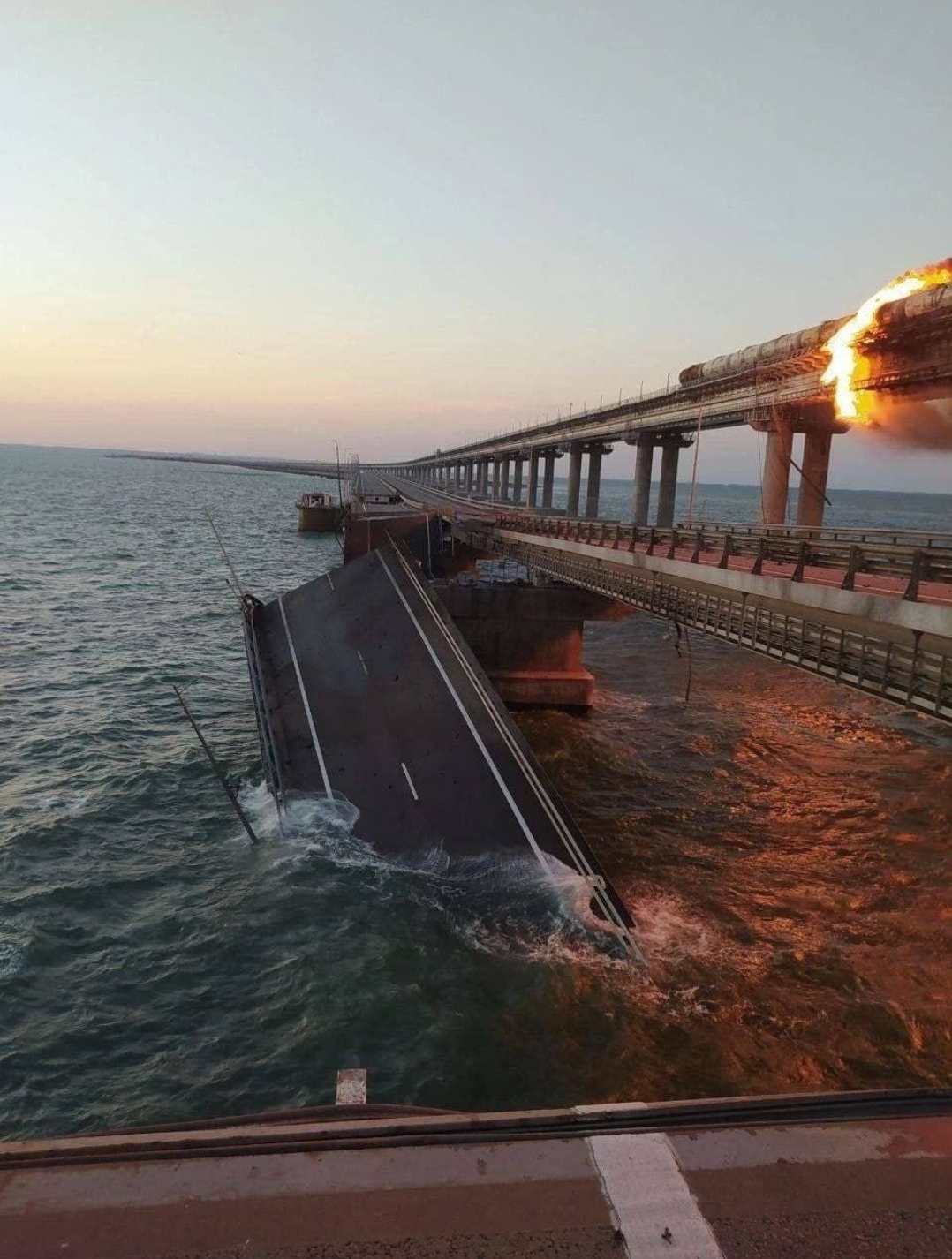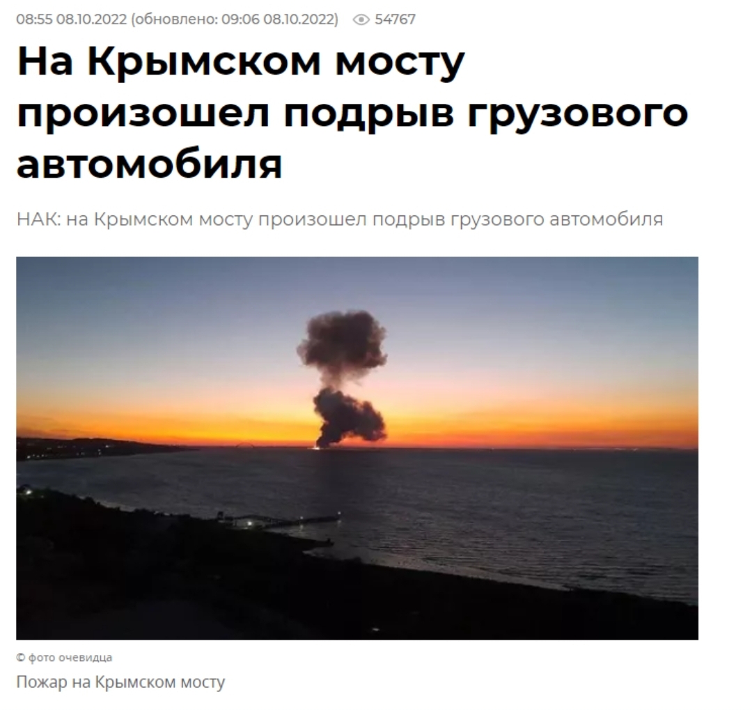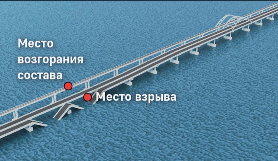 اللجنة الوطنية لمكافحة الإرهاب في روسيا : "في الساعة السادسة وسبع دقائق إنفجرت شاحنة على مسار السيارات في جسر القرم ، تسبب ذلك في إندلاع حريق في سبعة خزانات وقود لقطار كان في طريقه الى شبه جزيرة القرم " .