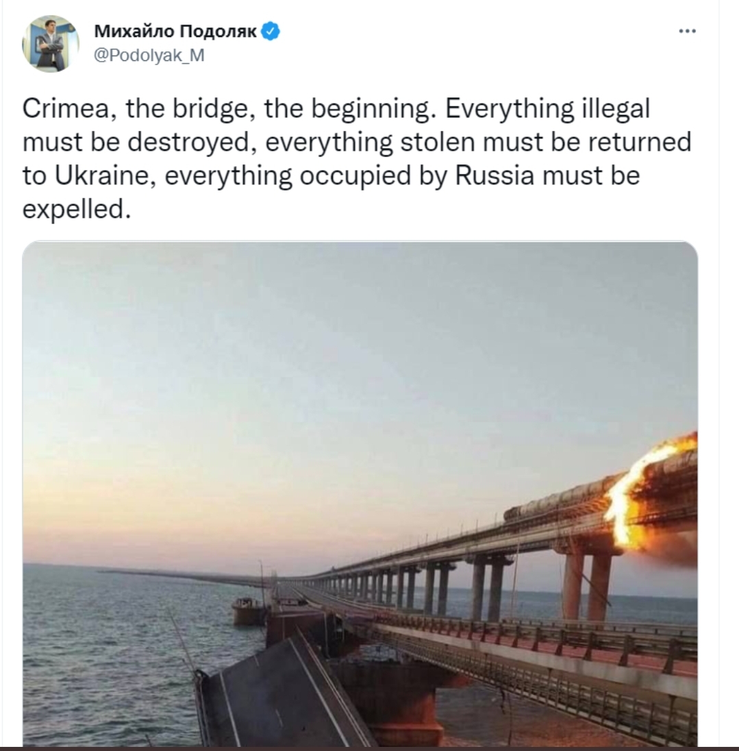تغريدة لميخائيل بودولياك مستشار زيلينسكي عن إنفجار جسر القرم :