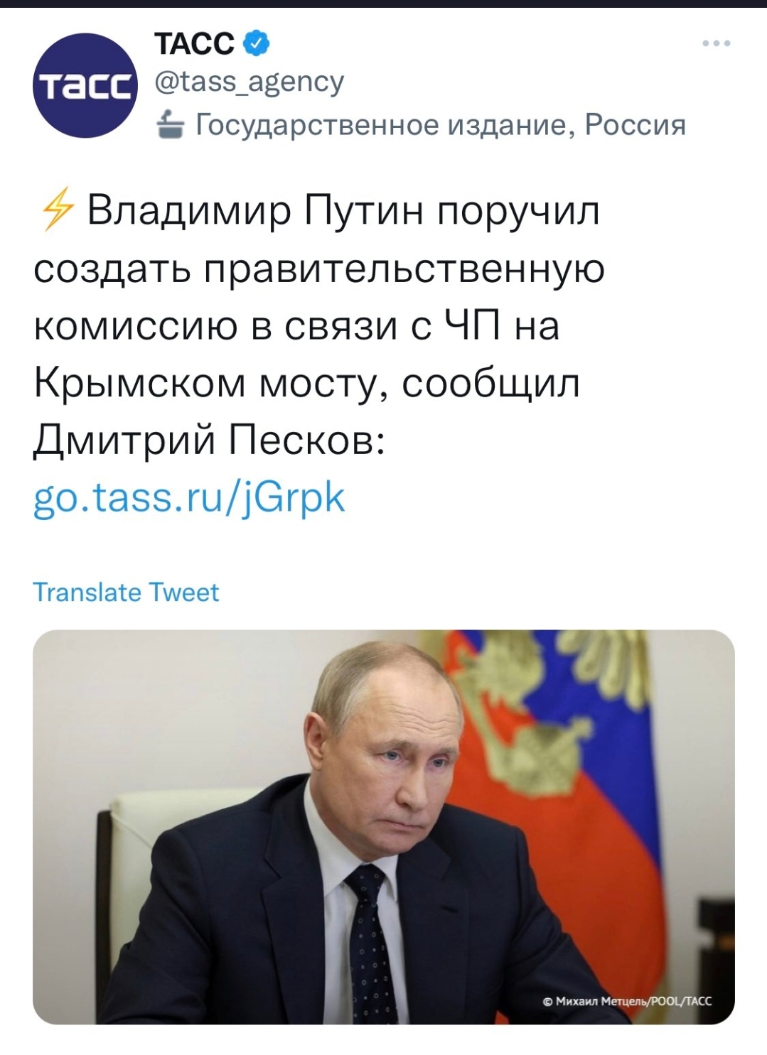 بوتين أصدر تعليمات بإنشاء لجنة حكومية فيما يتعلق بحالة الطوارئ على جسر القرم .