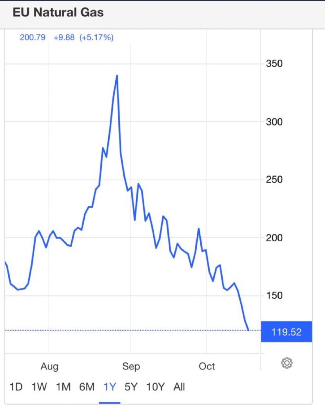 ثمن الغاز في أوروبا نزل من 337 في اوج أزمة الغاز إلى 113 وحدة حرارية وهذا الثمن يقارب ثمنه في نهاية كورونا وقبل بداية الحرب