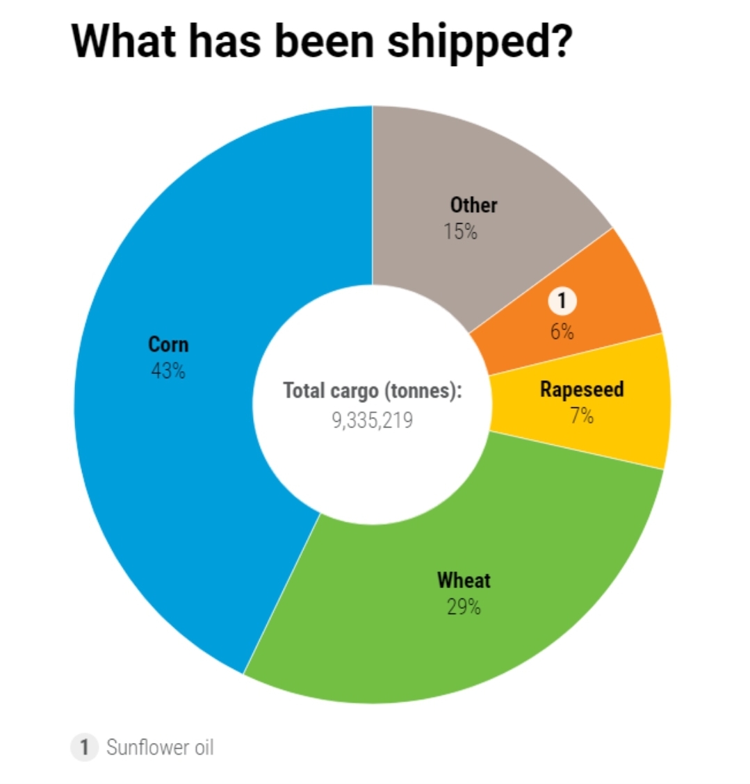 منذ بداية الإتفاق حتى يوم البارحة غادرت الموانئ الأوكرانية 455 شحنة من الحبوب والمنتجات الزراعية ، شكلت منها الذرة 43% و القمح 29% و زيت عباد الشمس 6% .