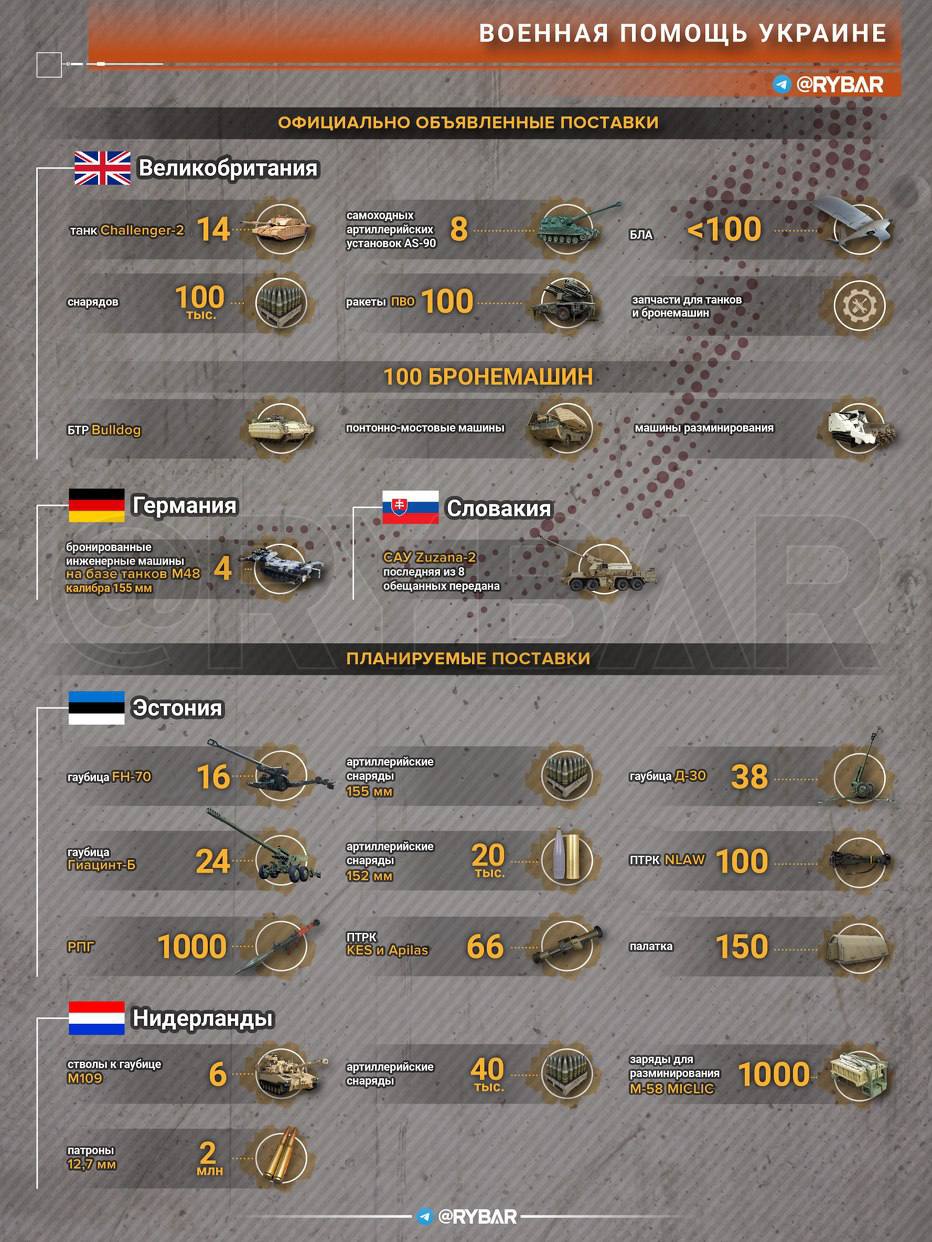 مساعدات عسكريه كبيره لاوكرانيا من كل من بريطانيا وأستونيا وهولندا , بينها مليون طلقه ودبابات ومدافع وصواريخ مضادة للدروع ودرونات ودفاع جوي ومدرعات