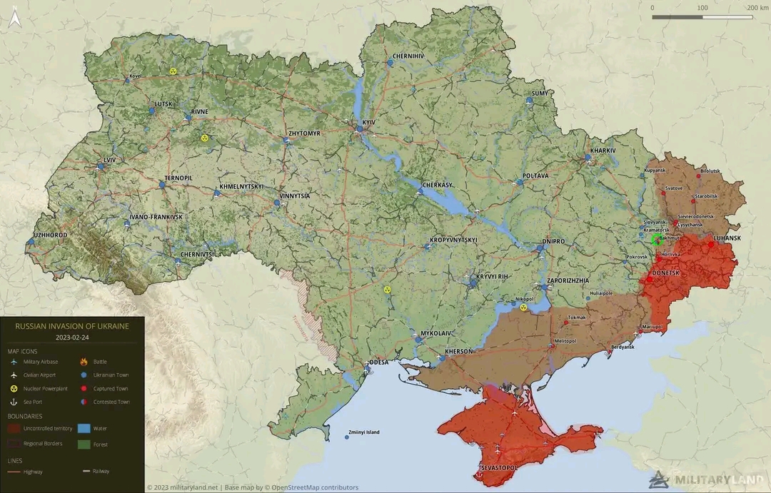 الأحمر ما كانت تسيطر عليه روسيا والانفصاليين قبل الغزو، الأحمر الباهت ما سيطرت عليه بعد الغزو، بدون احتساب ما فقدته.