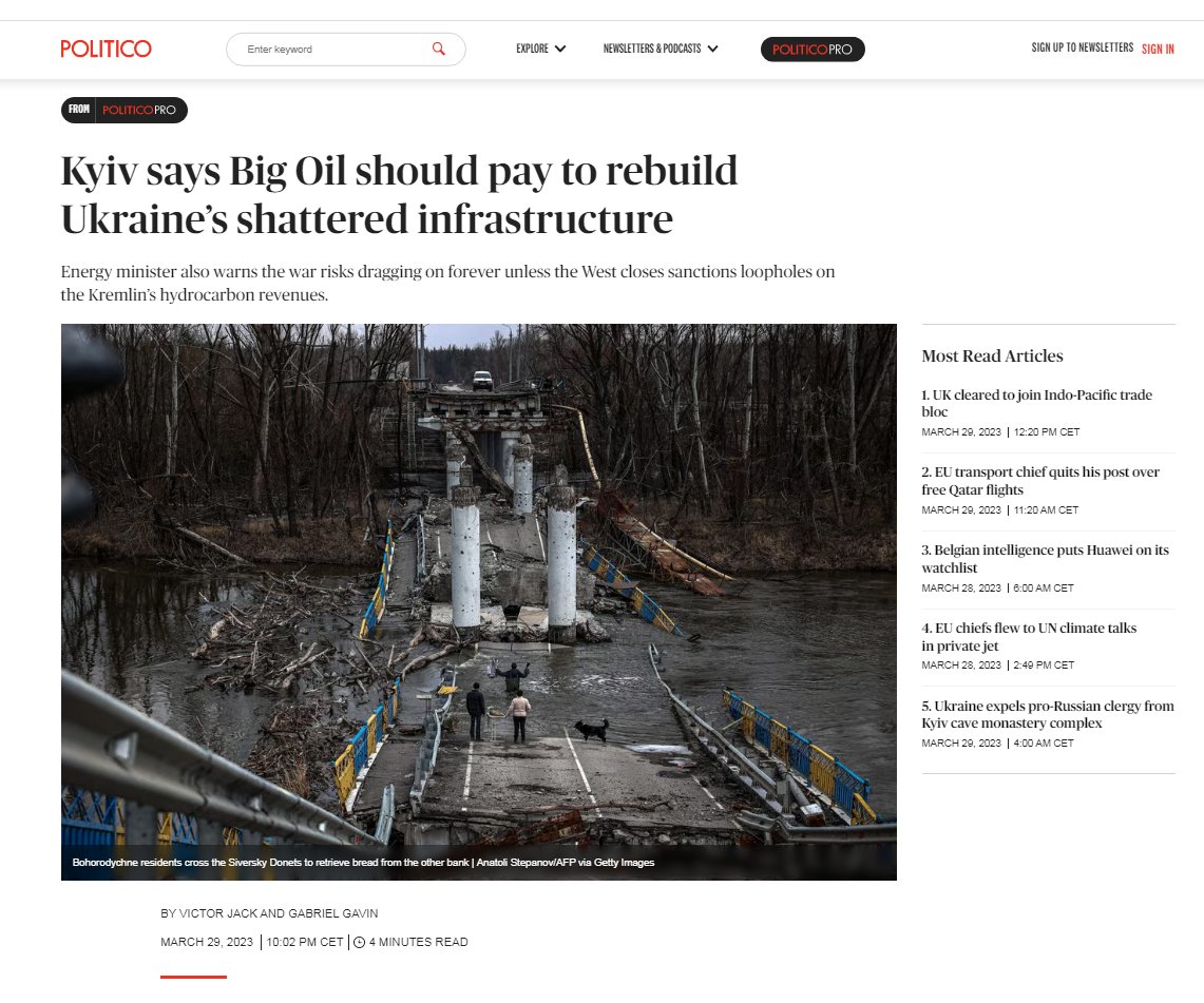 مشاهدة المرفق 564394قال وزير الطاقة الأوكراني "هيرمان جالوشينكو" أنه يتوجب على شركات النفط العالمية أن تشارك أرباحها الكبيرة مع أوكرانيا لأنها حققت أرباحًا جيدة بسبب القفزات في أسعار الطاقة على خلفية الحرب الروسية على بلاده ، لذلك ، يرى "جالوشينكو" أنه من العدل مشاركة هذه الأموال مع كييف للمساعدة في استعادة قطاع الطاقة وإعادة بنائه