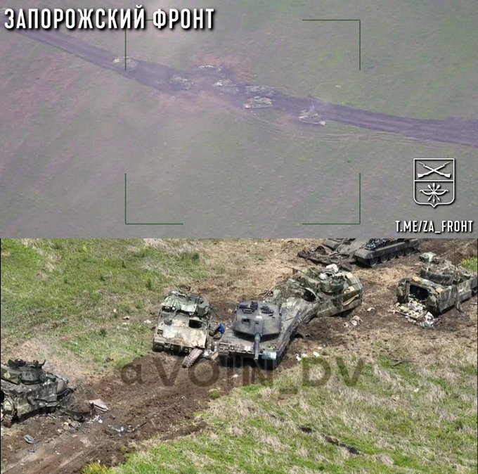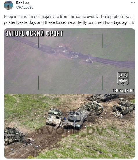 عربات Bradleys ودبابات Leopard 2A6 المعطوبة دخلت في حقل ألغام مضاد للدروع وتعرض بعضها للضرر الشديد، وهذا واضح من الجنازير المبعثرة قرب الأهداف !!! الأوكران مثلهم مثل الهنود يمكن أن يسيئوا لأي سلاح متطور ويجعلوه أضحوكة بسبب سوء الإستخدام وضحالة الفكر (يجب أن لا ننسى أنهم يتبعون المذهب الشرقي في إستخدام الوحدات المدرعة) !!! أرتال الدبابات وكما هو معروف، تستطيع عبور وتجاوز حقول الألغام بدعم من العربات المجهزة بمحاريث الألغام mine ploughs أو الدقاقات، لكن دخول حقل ألغام دون إستعداد مسبق هو الحماقة بعينها !!! عموما الخسائر متوقعة والحرب تسير كما يخطط الغرب لها بإستنزاف طاقة وقوة الروس، وفي النهاية الغرب سيستمر بدعم الأوكران وتزويدهم بمزيد من السلاح والذخيرة.