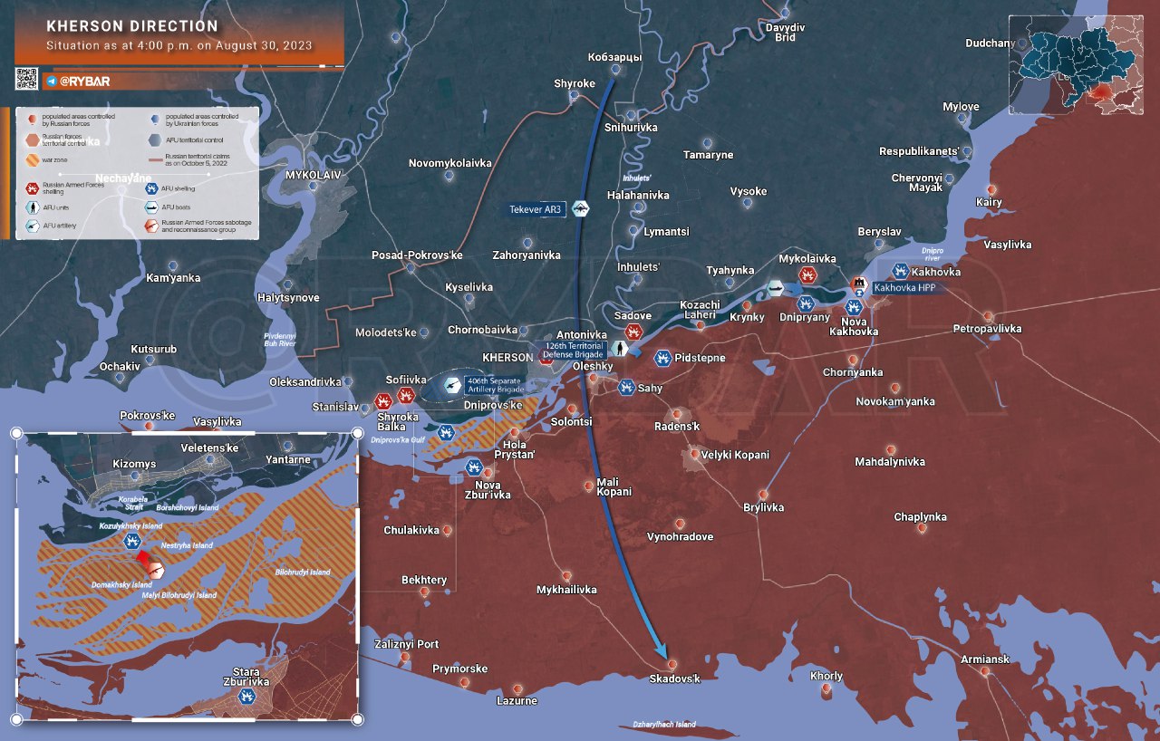 إلى الغرب، من خط نوفودميتريفكا-بيلوسيرسكا، قصفت وحدات من لواء المدفعية 406 SKU جزيرة ستارا زبورفكا وجزيرة كوسوليخسكي. وتشير الهجمات على الجزيرة إلى أن هذه المنطقة تقع على الأقل في المنطقة الرمادية التي تعمل فيها وحدات الاستطلاع لدينا.