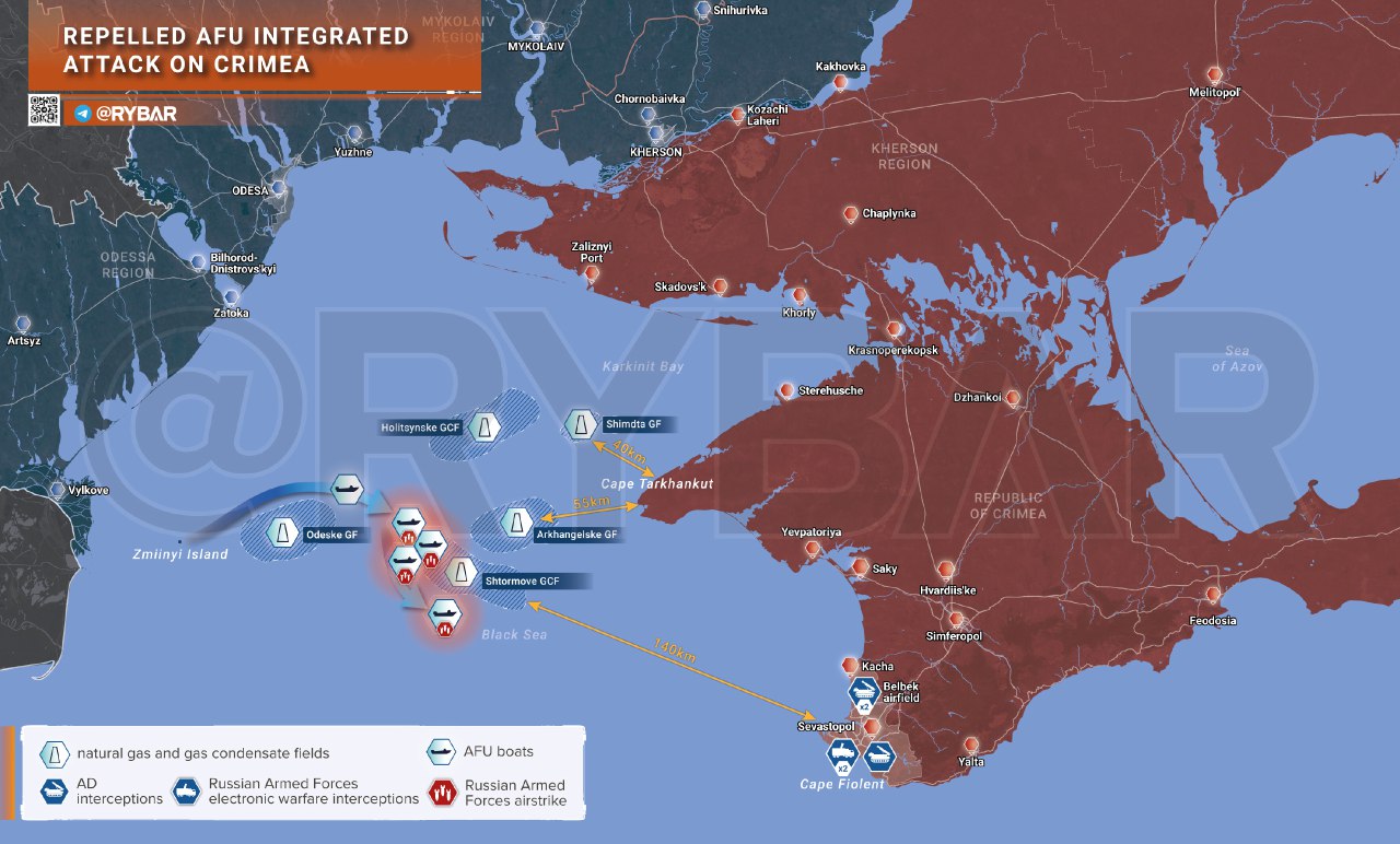 تم رصد تحركات قوات GUR وقوات سوريا الديمقراطية الأوكرانية على متن 14 زورقًا مسبقًا. تم إرسال طائرات Su-24 التابعة لأسطول البحر الأسود إلى المنطقة التي كانت تتحرك فيها وتم ضربها بأربع قنابل عنقودية من طراز RBK-500 في الساعة 7:39 مساءً و7:40 مساءً.