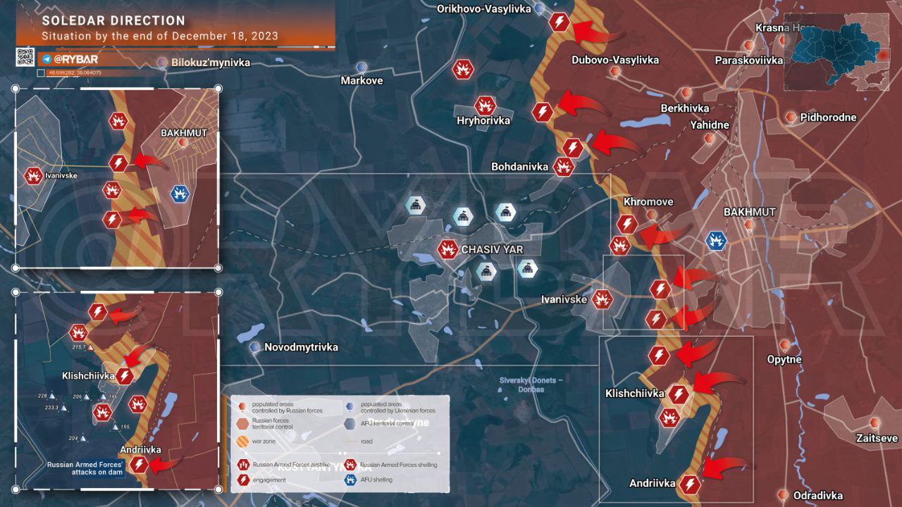 في اتجاه سوليدار، تشن القوات المسلحة الروسية هجوماً نشطاً على طول خط المواجهة بأكمله. وعلى الجانب الشمالي، تحاول القوات الروسية التقدم نحو كراسني والسيطرة على الطريق المؤدي إلى تشاسوف يار. في هذه الأثناء، تنفذ وحدات من القوات المسلحة الروسية جنوب باخموت هجمات على خط كليشيفكا-أندريفكا.