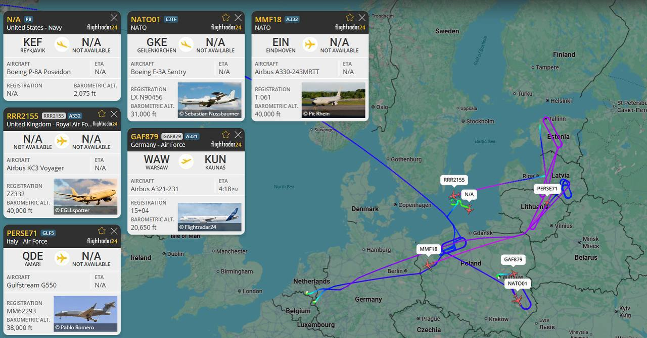 اليوم يوم متوتر فوق شرق أوروبا، مع عدد من الأصول المراقبة والقيادة والسيطرة والتزود بالوقود جواً من الولايات المتحدة وحلف النيتو فوق بحر البلطيق وبولندا، بما في ذلك طائرة الإنذار المبكر والنقل الجوي لحلف النيتو E-3A Sentry بالقرب من الحدود بين بولندا وأوكرانيا.