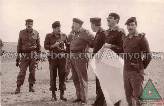 اللواء الركن احمد راكان الشمري قائد الفرقة الثانية مع اللواء فوزي البرزنجي يرتدي الخوذة الفولاذية مجاور احد المواقع الحصينة في قاطع لواء الايوبي مقابل حقل مجنون الجنوبي قاطع الزرداني شرق مدينة القرنة سنة 1985 الطالب الذي ورد اسمه انفا .